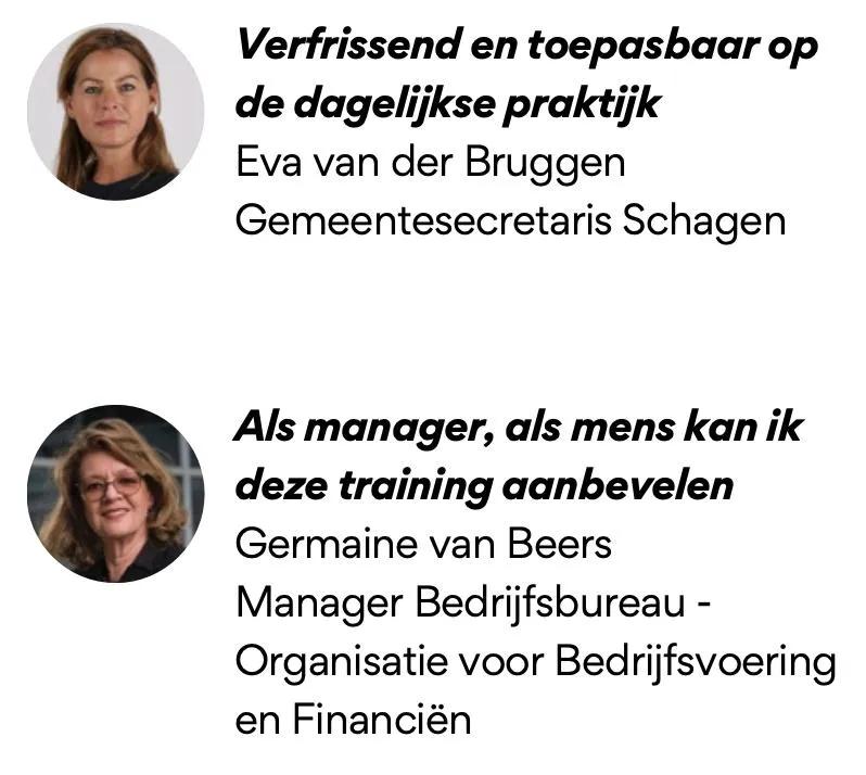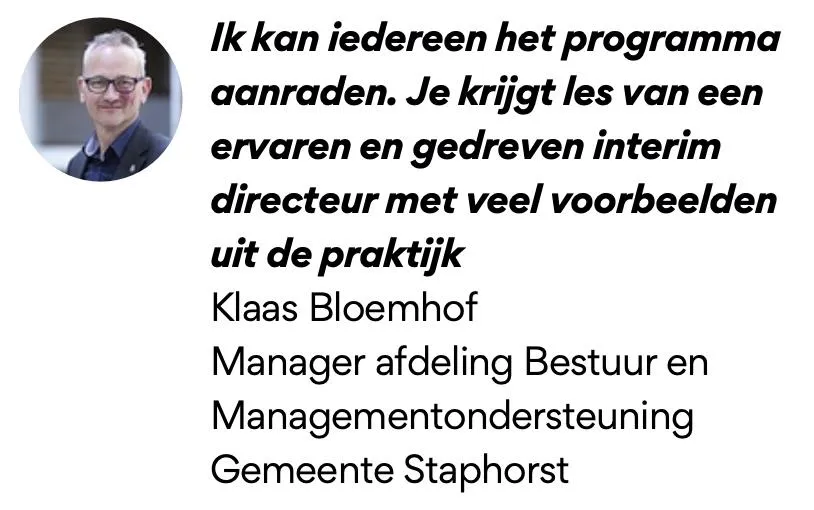 Vanaf de eerste meeting wist ik al we zijn allen mens en willen het beste uit onszelf halen en betekenen voor onze organisatie. Het gaat er niet om wat je zou moeten willen, maar hoe jij het gaat organiseren om jezelf te ontwikkelen en jouw organisatie met iedereen mee te nemen naar de toekomst. Al is dat in de publieke sector soms spannend. Het programma geeft je moed en inzicht om keuzes op langere termijn te organiseren. En om tijd vrij te maken voor jezelf en wat echt belangrijk is. Niet alleen op het werk, maar ook privé. Als manager, als mens kan ik deze training aanbevelen als jij jezelf terug wilt vinden in alle hectiek. Of je nu directeur of directielid bent met een veranderopgave of gewoon jezelf andere inzichten gunt. Alexander heeft zijn eigen no nonsens verhaal en tips. Maar jij bent zelf aan zet.