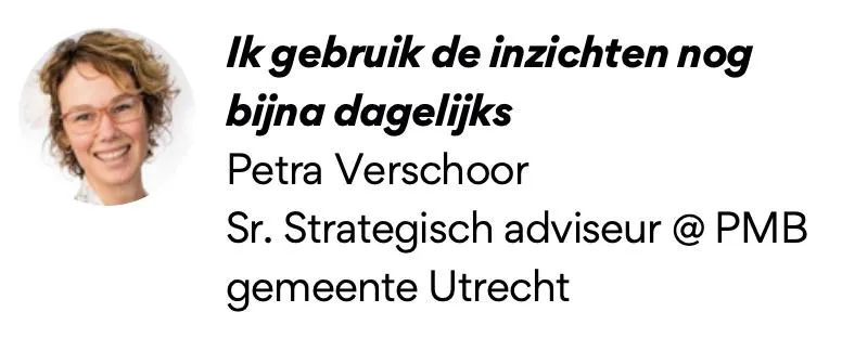 Ik heb veel geleerd, het past ook bij mijn huidige fase in mijn loopbaan en mijn persoonlijke ontwikkeling. Wat ik leuk vind is dat het een hele andere insteek heeft dan mijn eerder opleidingen. Ik heb best een serie achter de rug, HBO Europese studies, Bestuursacademie HBDO AJZ, WO Bestuurskunde in Leiden en tweede master Publiek Management aan Tias. Allemaal vooral theoretisch georiënteerd. Deze opleiding heeft een hele andere en voor mij nieuwe insteek. Dat vind ik verfrissend en toepasbaar op de dagelijkse praktijk.